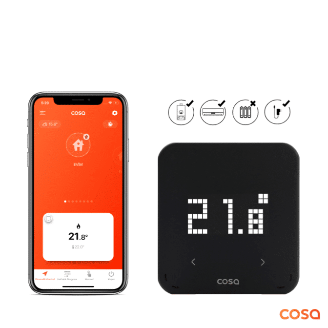 - Cosa Akıllı Oda Termostatı Kombi Kontrolü aç/kapa tipi oda termostatı girişi olan tüm ısıtma sistemleri (kombi gibi) ile uyumludur.